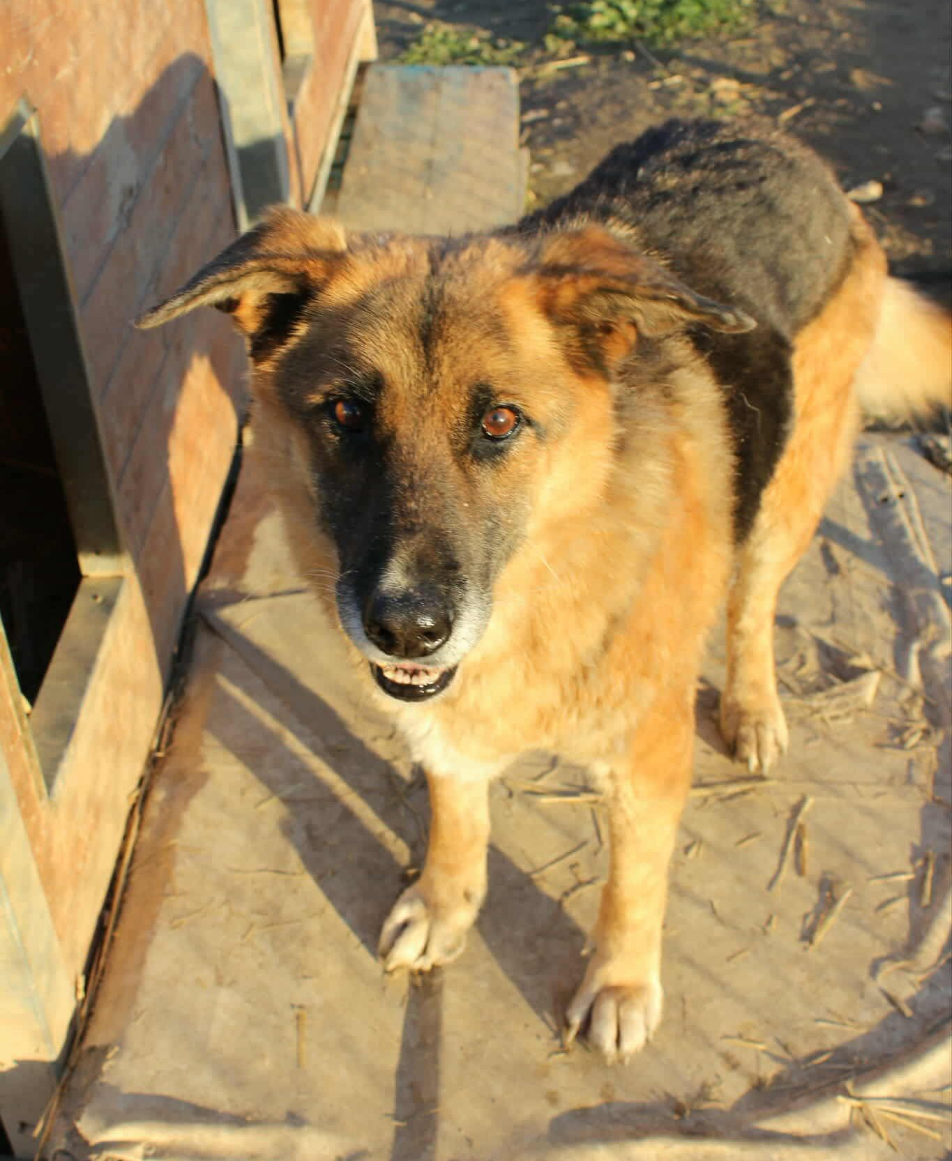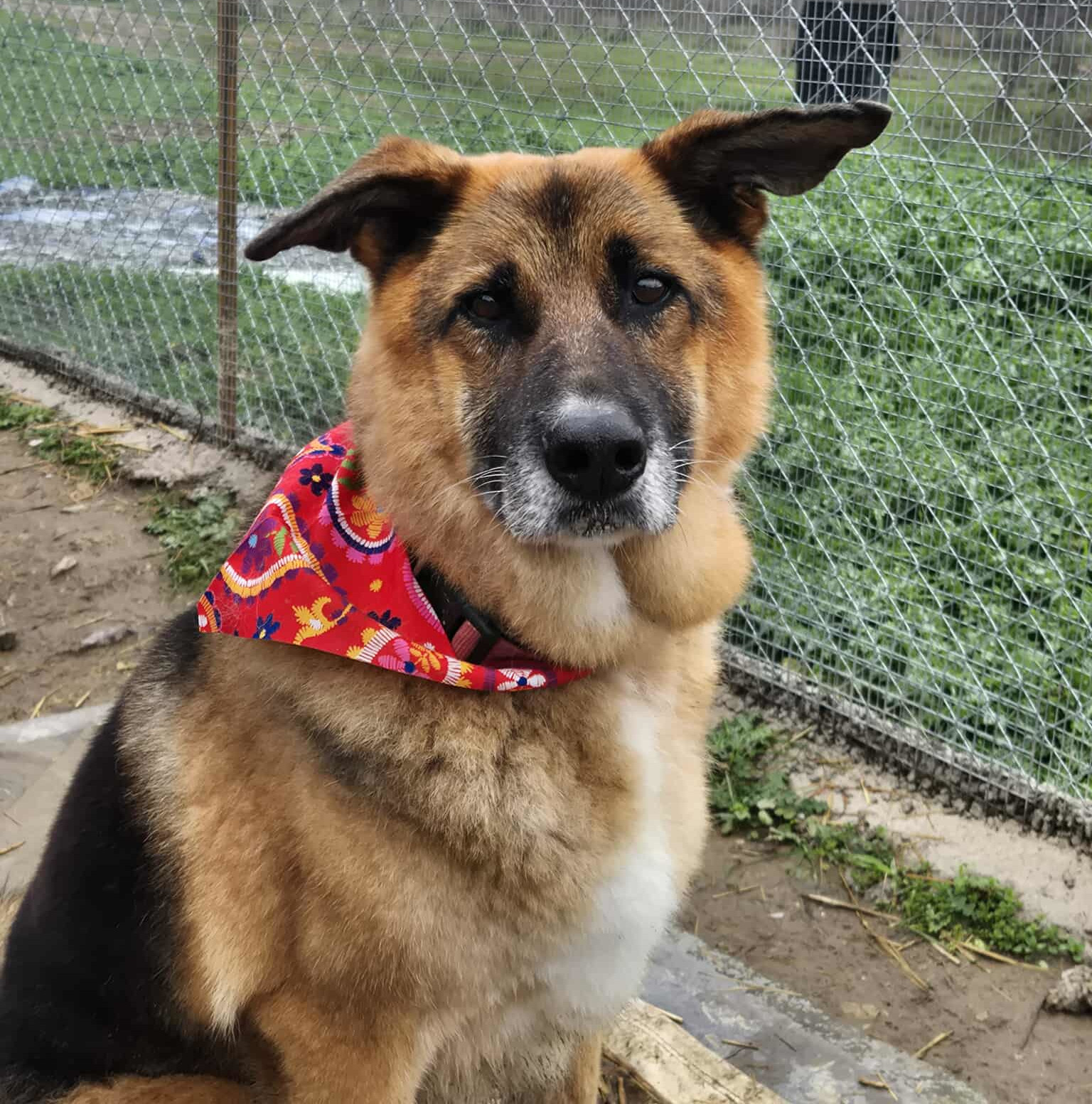 Panoulis ist ein ganz besonderer Hund – nicht nur vom Wesen, sondern auch von seiner Ausstrahlung her: Mit seinem dichten schwarz-braunen Fell, der markanten dunklen Gesichtsmaske und seinen warmen, vorsichtigen Augen wirkt er zugleich eindrucksvoll und unglaublich sanft. Seine leicht abstehenden Ohren und sein ruhiger Blick lassen sofort erkennen, wie freundlich und gutmütig er ist.