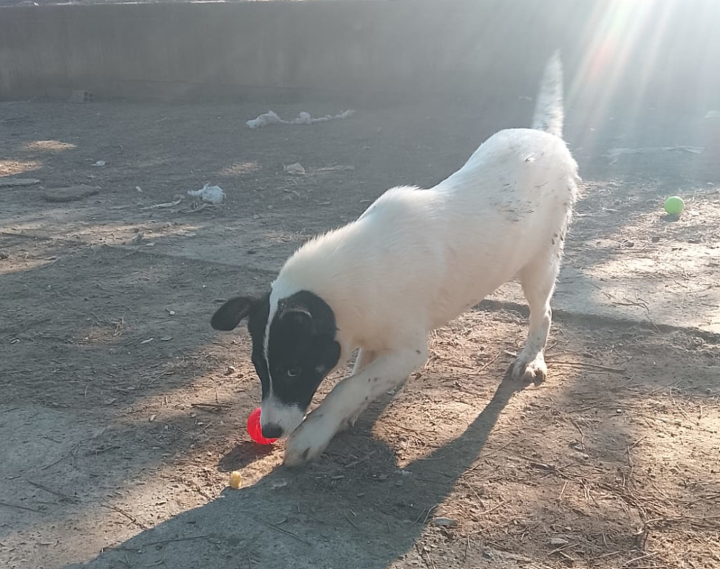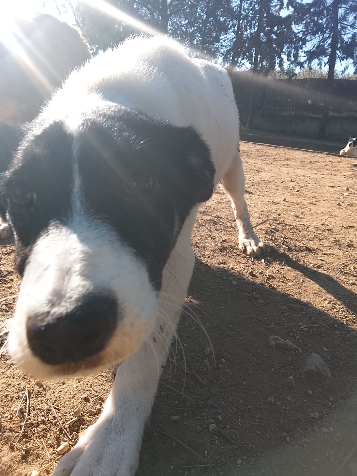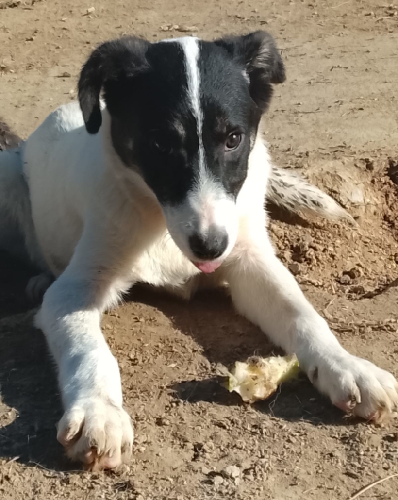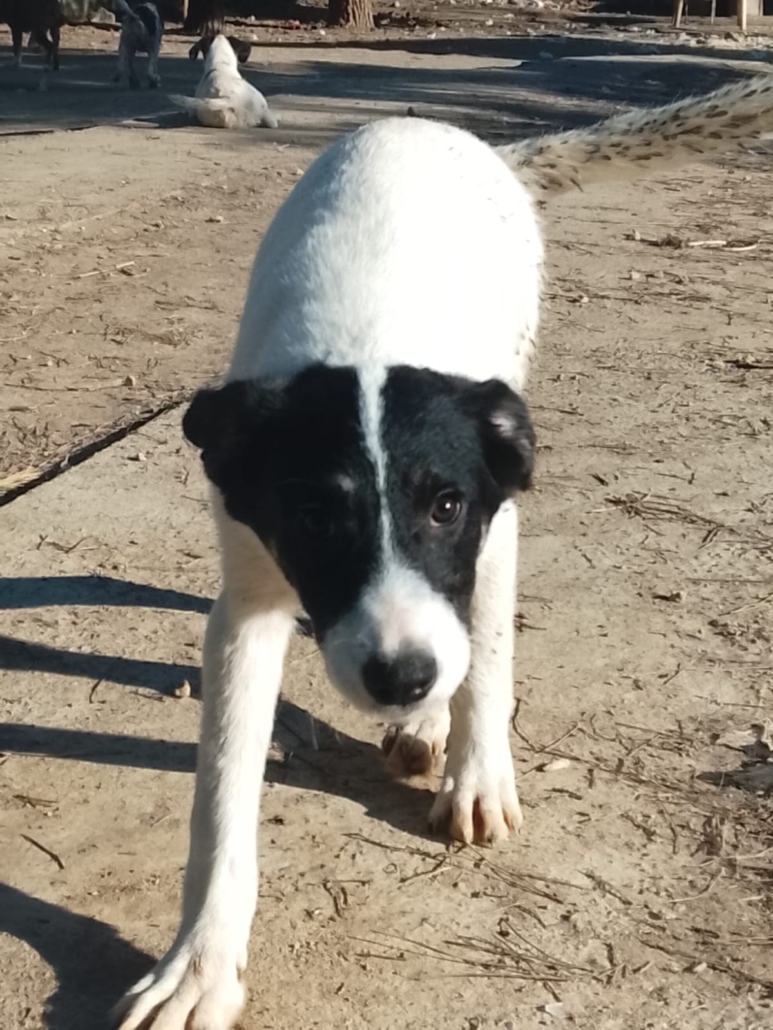 Aphrodite fällt sofort durch die feine weiße Linie auf, die sich über ihr Gesicht bis zur Stirn zieht. Während Kopf und Ohren schwarz gefärbt sind, ist ihr übriges Fell schneeweiß – zumindest dann, wenn sie nicht gerade mit Begeisterung durch Matschpfützen tobt. Charakterlich zeigt sich Aphrodite selbstbewusst und unter ihren Geschwistern übernimmt sie gerne die Führung. Gleichzeitig ist sie sehr menschenbezogen und hält sich gern in der Nähe ihres Pflegepapas auf, immer in der Hoffnung, eine Streicheleinheit zu erhaschen oder selbst Liebkosungen zu verteilen.