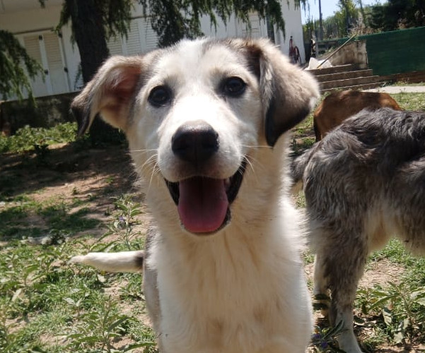 Ein Hund steht auf einer grünen Wiese und schaut in die Kamera. Im Hintergrund ist ein Gebäude mit geschlossenen Fensterläden sichtbar. Die Szene ist sonnig und zeigt auch einen weiteren Hund.