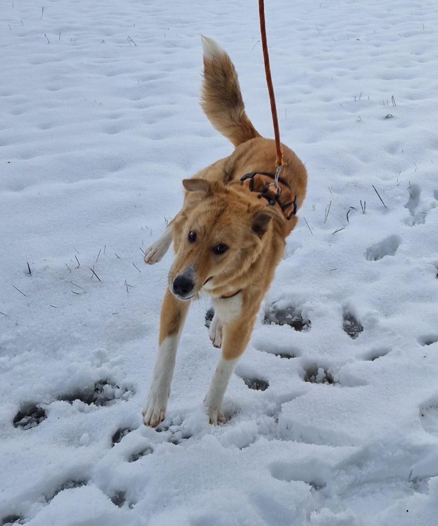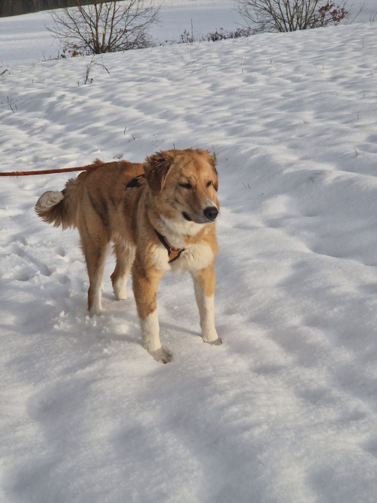 Schon in Griechenland konnte er sich gut von seinem schwierigen Start ins Leben erholen. Als er in Deutschland ankam, war er nicht mehr der kleine, viel zu dünne Hundejunge, sondern ein stattlicher, hübscher Junghund mit neugierigen Augen und einem Herz voller Lebensfreude.