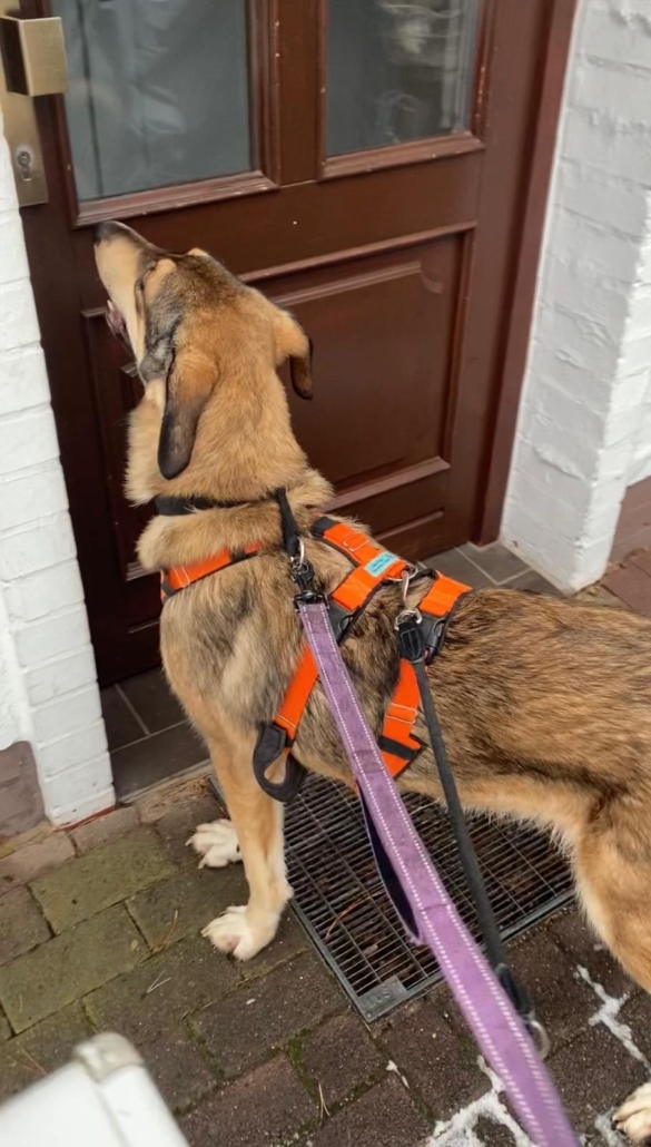 Ihre Pflegemama beschreibt Skadi als offene, neugierige und sehr anhängliche Junghündin. Sie geht ohne Vorurteile auf Menschen zu und begegnet jedem freundlich und freudig – auch bei Männern ist sie nicht befangen. Kuscheleinheiten haben es ihr dabei besonders angetan. Auch anderen Hunden gegenüber zeigt sich Skadi positiv aufgeschlossen und spielbereit. Sie versteht sich bestens mit dem Ersthund der Familie sowie mit den Nachbarshunden. Nur wenn ihr beim Spaziergang ein Artgenosse zu stürmisch begegnet, sucht sie zunächst Schutz bei ihren Menschen. Laute, unbekannte Geräusche – etwa von der Müllabfuhr – kann sie aktuell noch nicht immer einordnen. Das ist jedoch kaum verwunderlich, denn alles ist noch neu für sie. Umso schöner ist es zu sehen, wie anpassungsfähig Skadi ist und wie schnell sie sich an neue Reize gewöhnt. Bereits nach kurzer Zeit läuft sie erstaunlich gut an der Leine – fast so, als hätte sie nie etwas anderes gemacht.